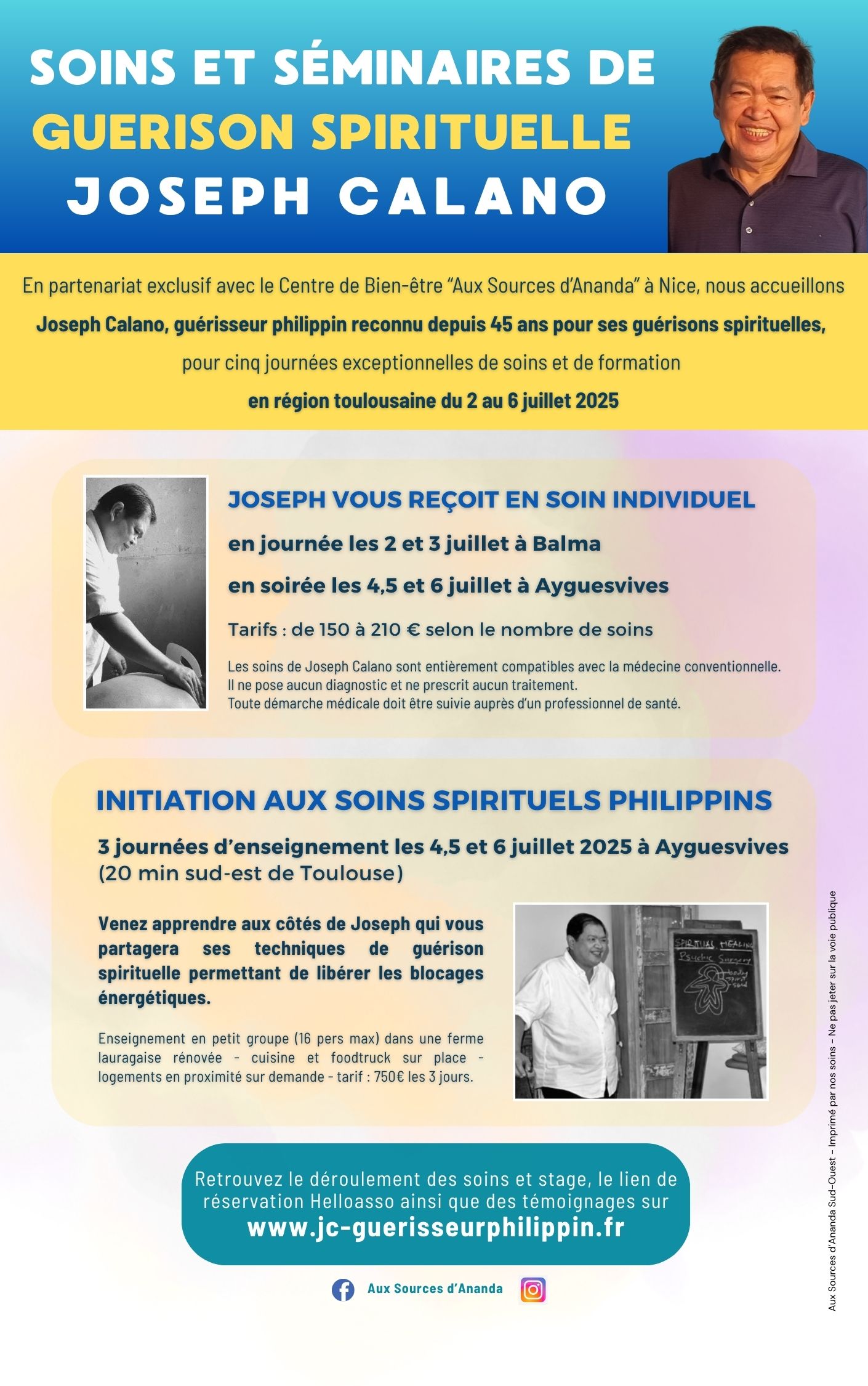 Joseph Calano sera présent en région toulousaine les 2 et 3 juillet 2025 pour dispenser des soins individuels de guérison à La Mane, et en suivant, une formation de 3 jours permettant de s’initier aux techniques de guérison spirituelle (Ayguesvives, 20 min sud-est de Toulouse).